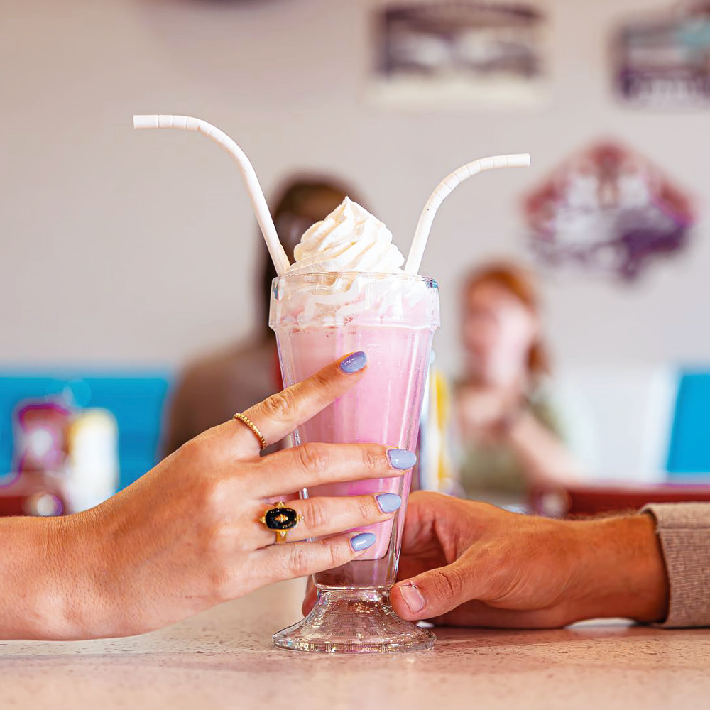 Feeling nostalgic for the past and looking to have some fun? Take on the challenge of dressing up retro-style and head out to enjoy a delicious Jukebox strawberry milkshake like in the good old days! One glass with two straws is the way to go! Add in a burger, and you’re in for a real treat…